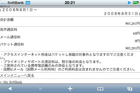 iPhoneの8月分のパケット料が出ました